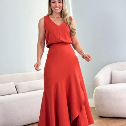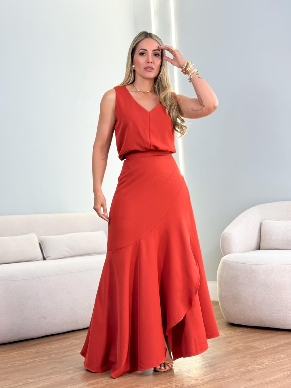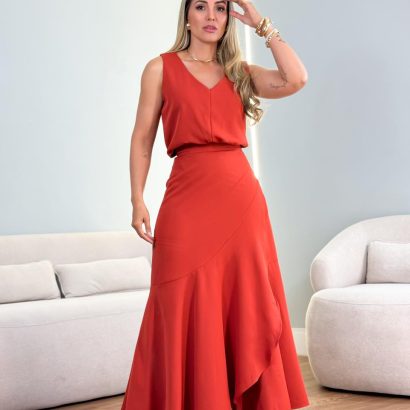 Conjunto alfaiataria saia envelope com folho + regata decote V