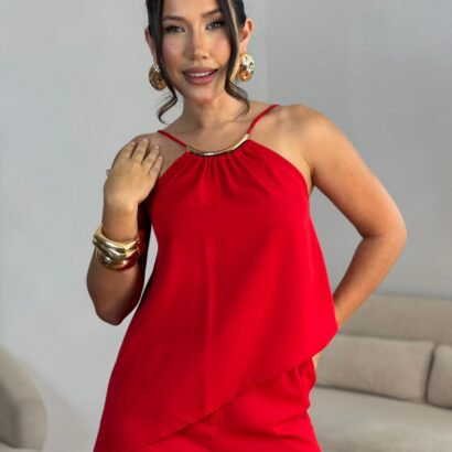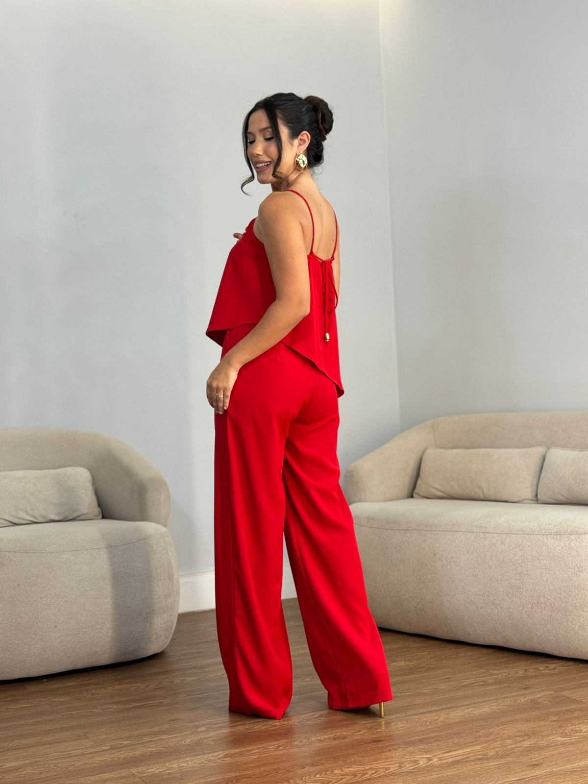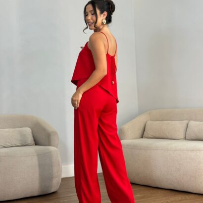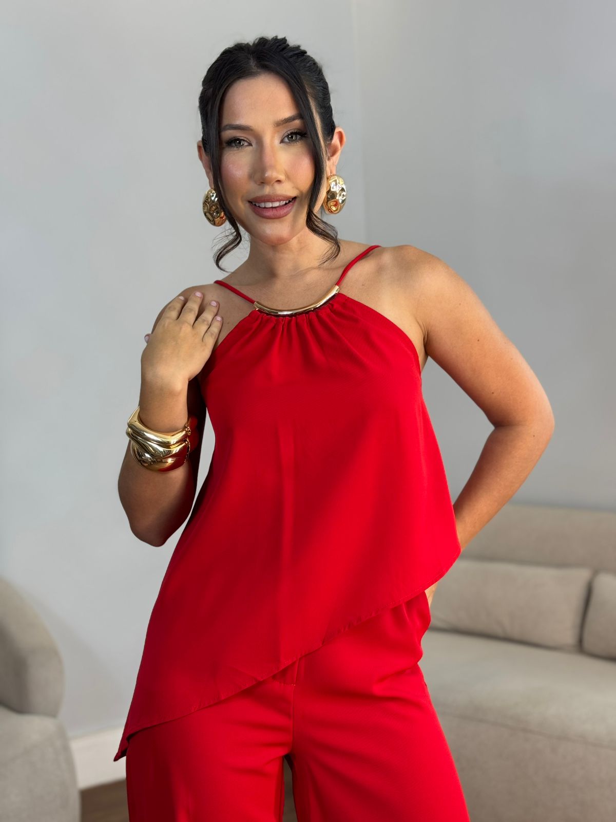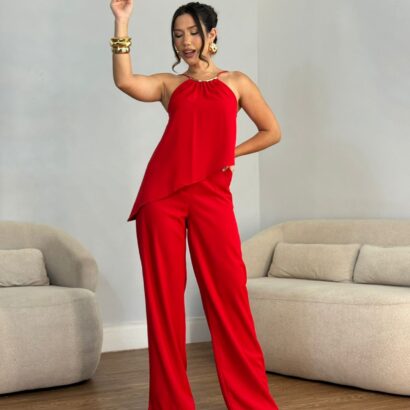 Conjunto plano pantalona + blusa assimétrica com aviamento