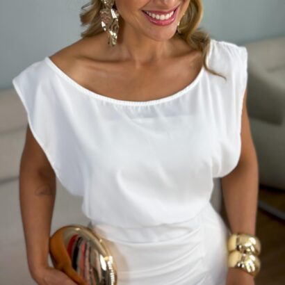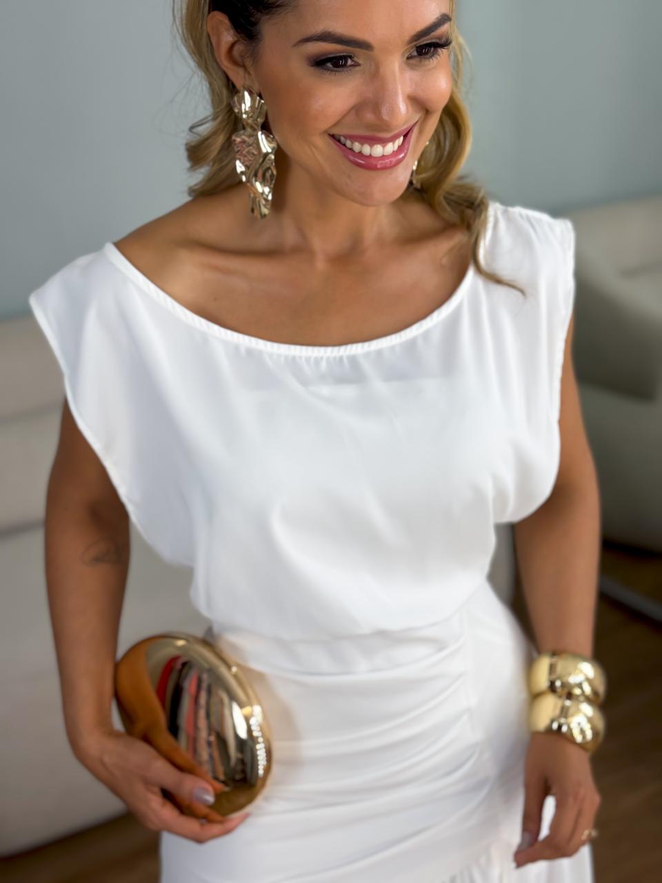 Vestido crepe seda peito despojado com top saia drapê assimétrica