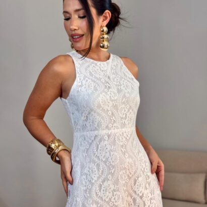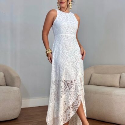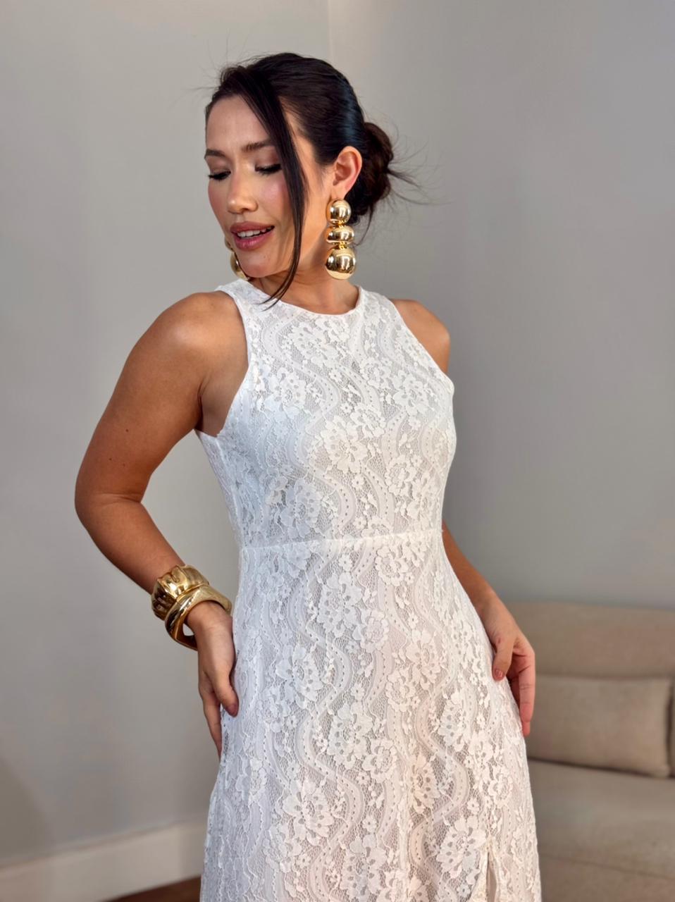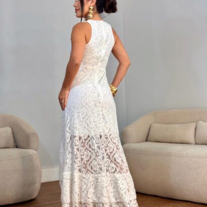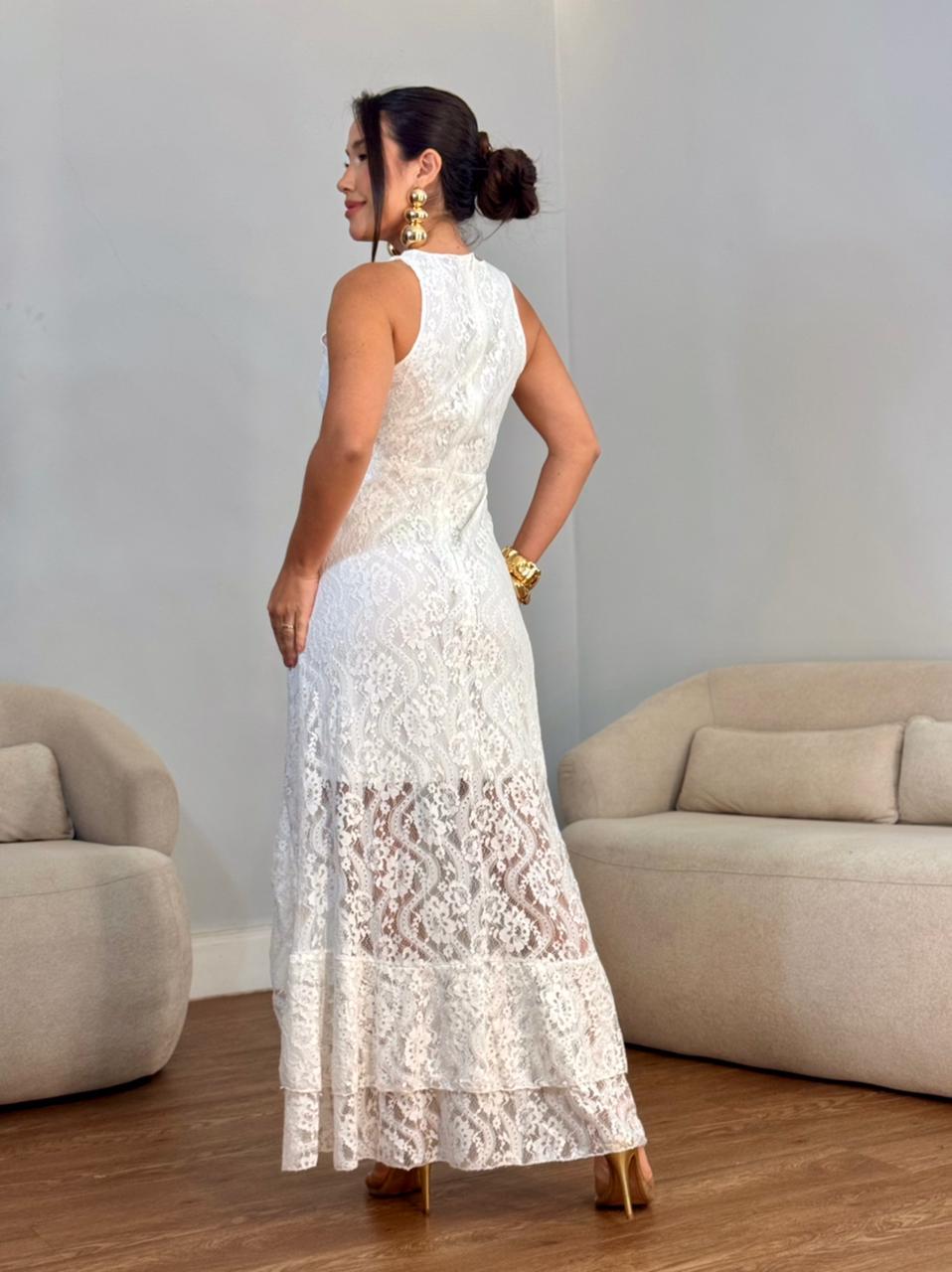 Vestido longo renda fenda frontal folho puplo