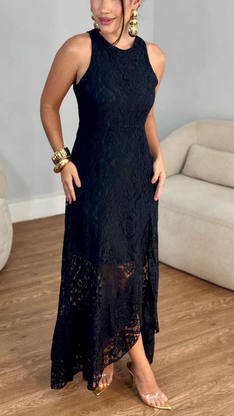 Vestido longo renda fenda frontal folho puplo