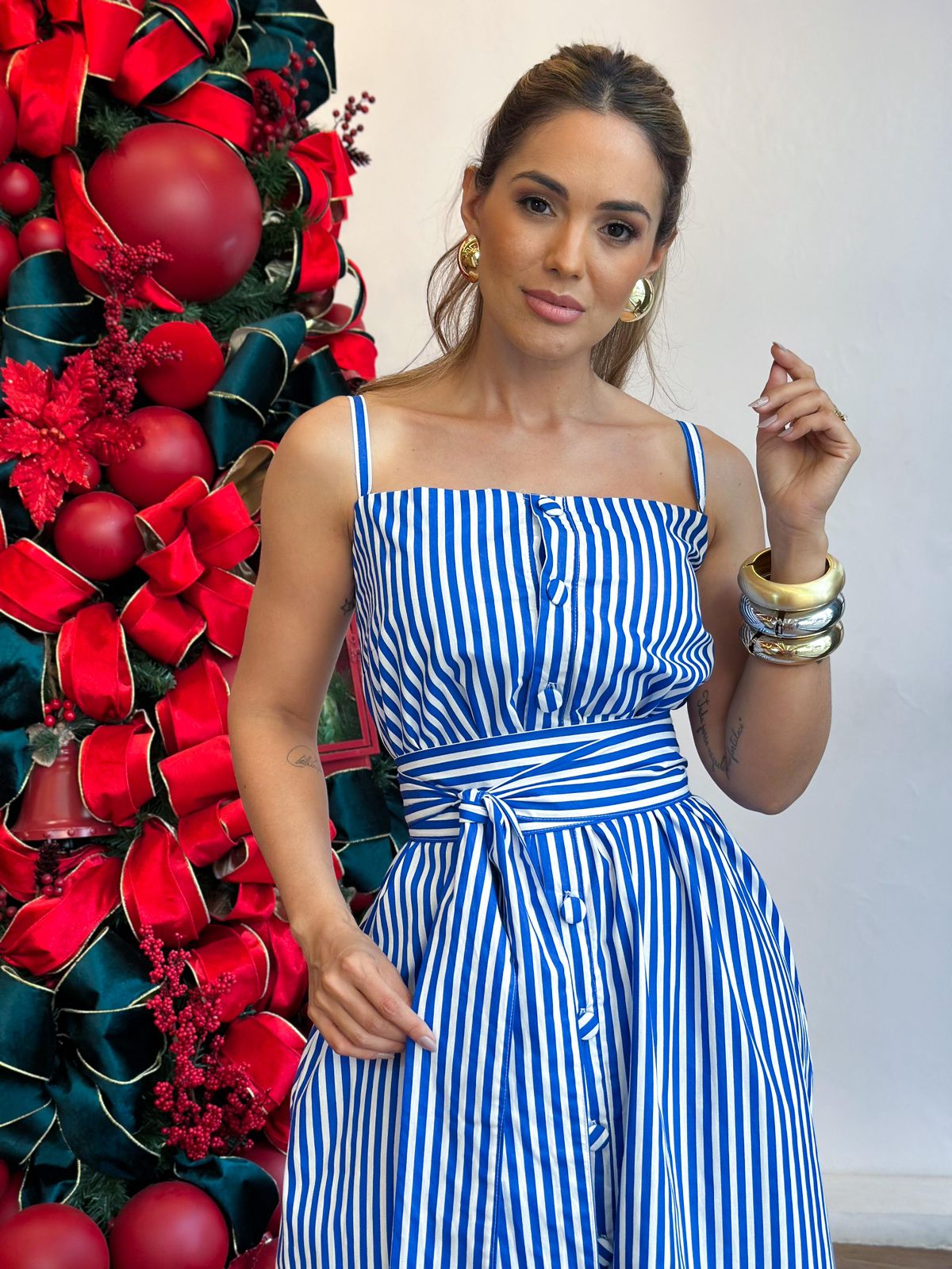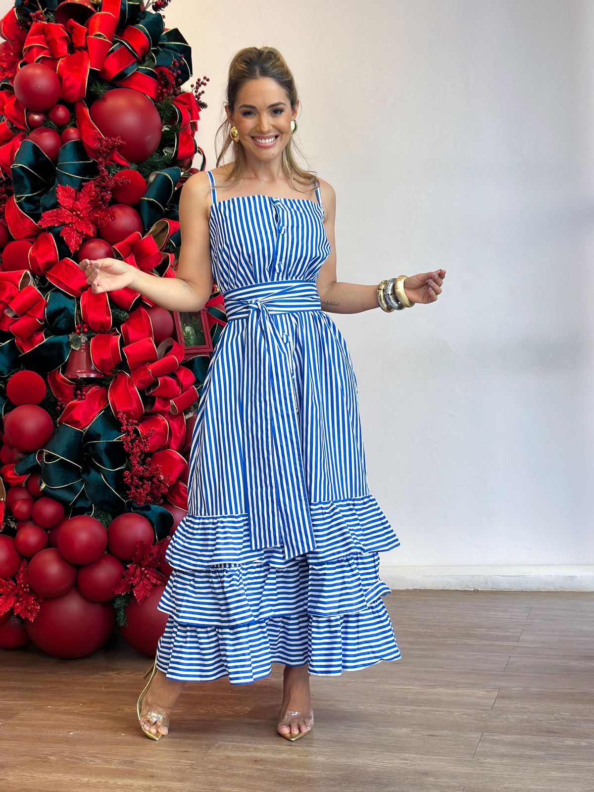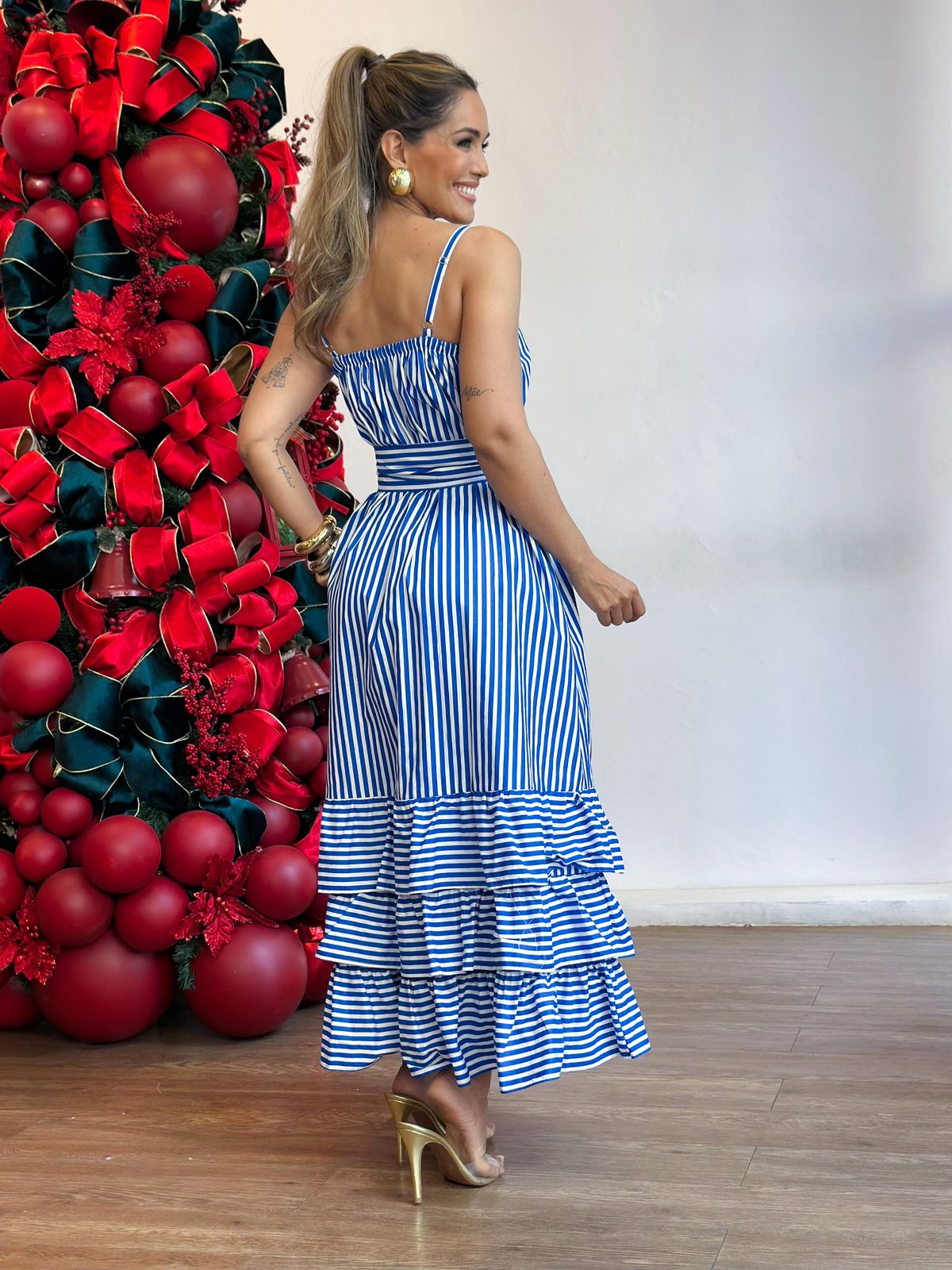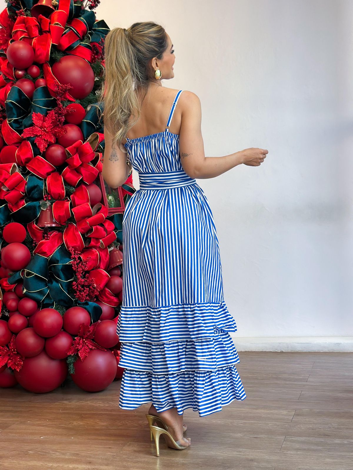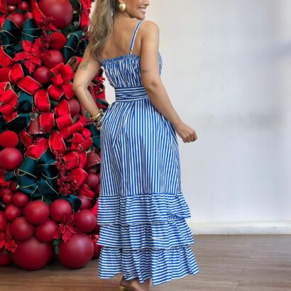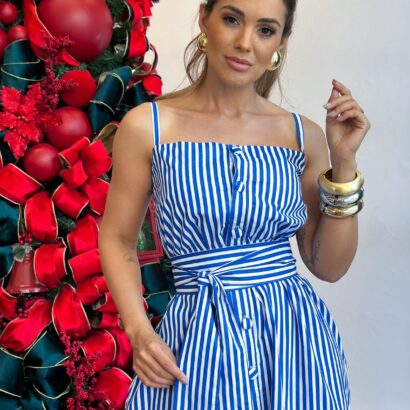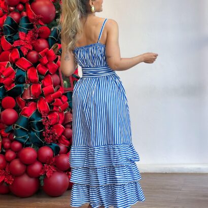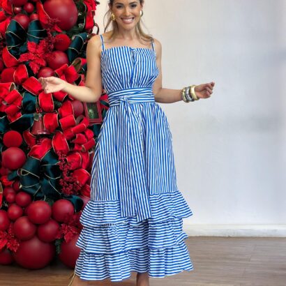 Vestido tricoline alça chemise todo botão barrado babados com faixa