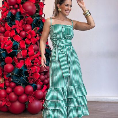 Vestido tricoline alça chemise todo botão barrado babados com faixa