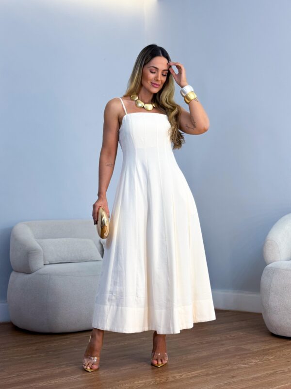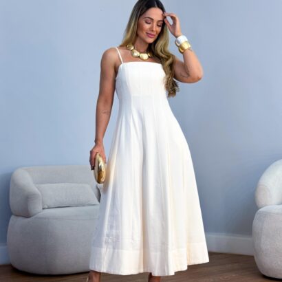 Vestido tricoline midi rodado recortes acint alça