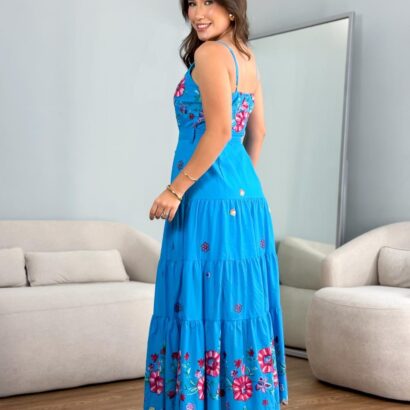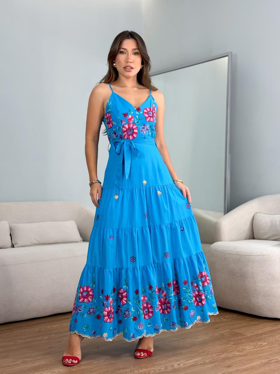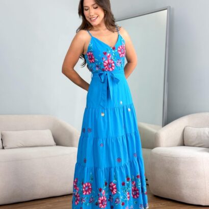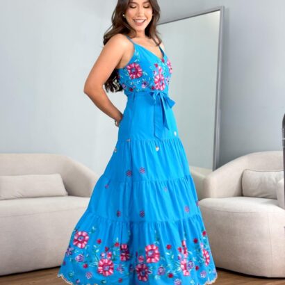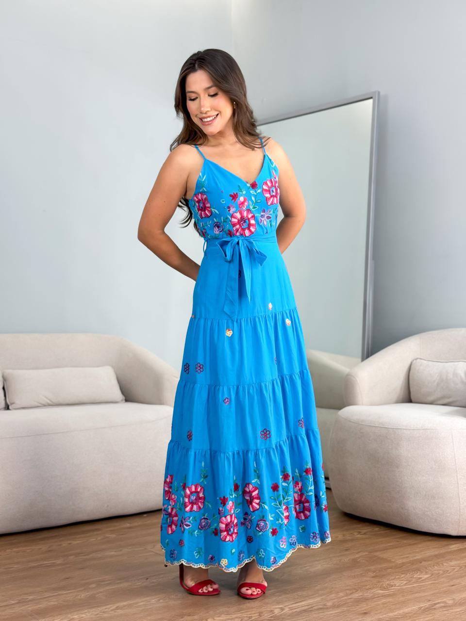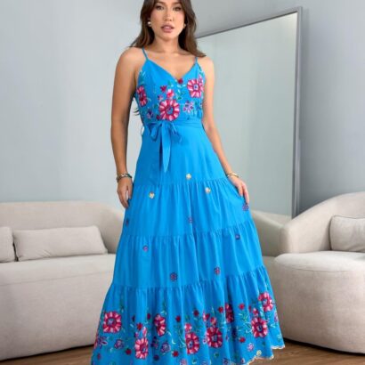 Vestido tricoline bordado laise colorido alça com faixa