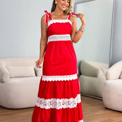 Vestido tricoline guipiz intercalado no corpo alça amarração