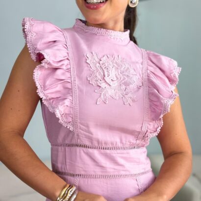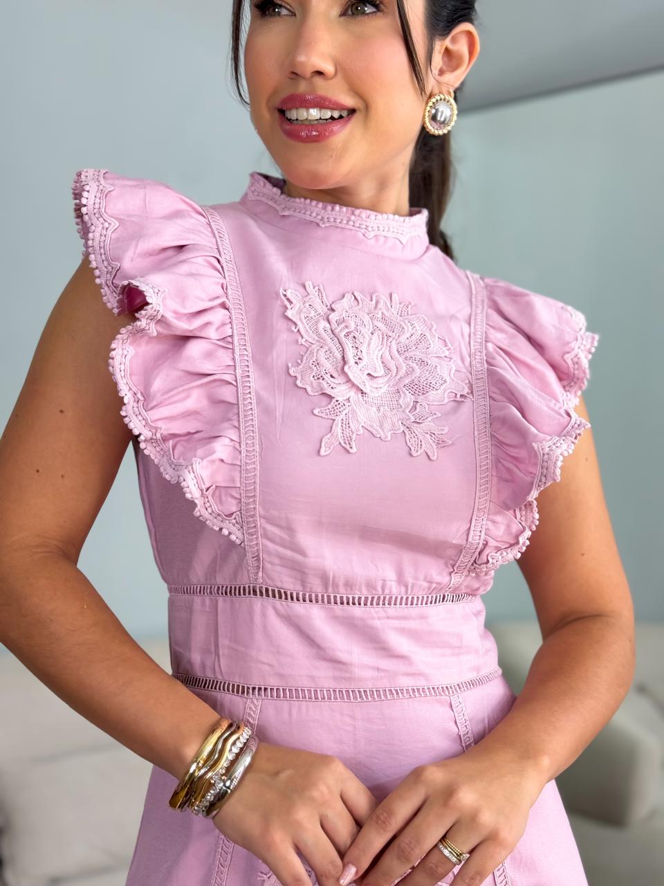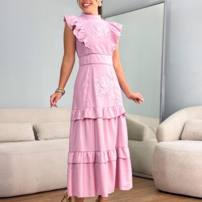 Vestido tricoline midi gola alta saia com babado flor 3D