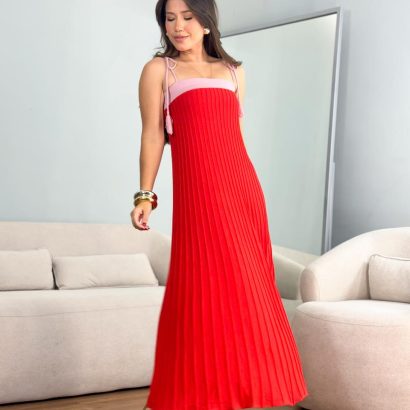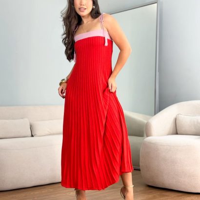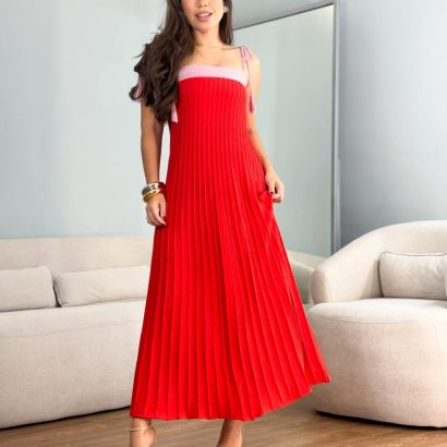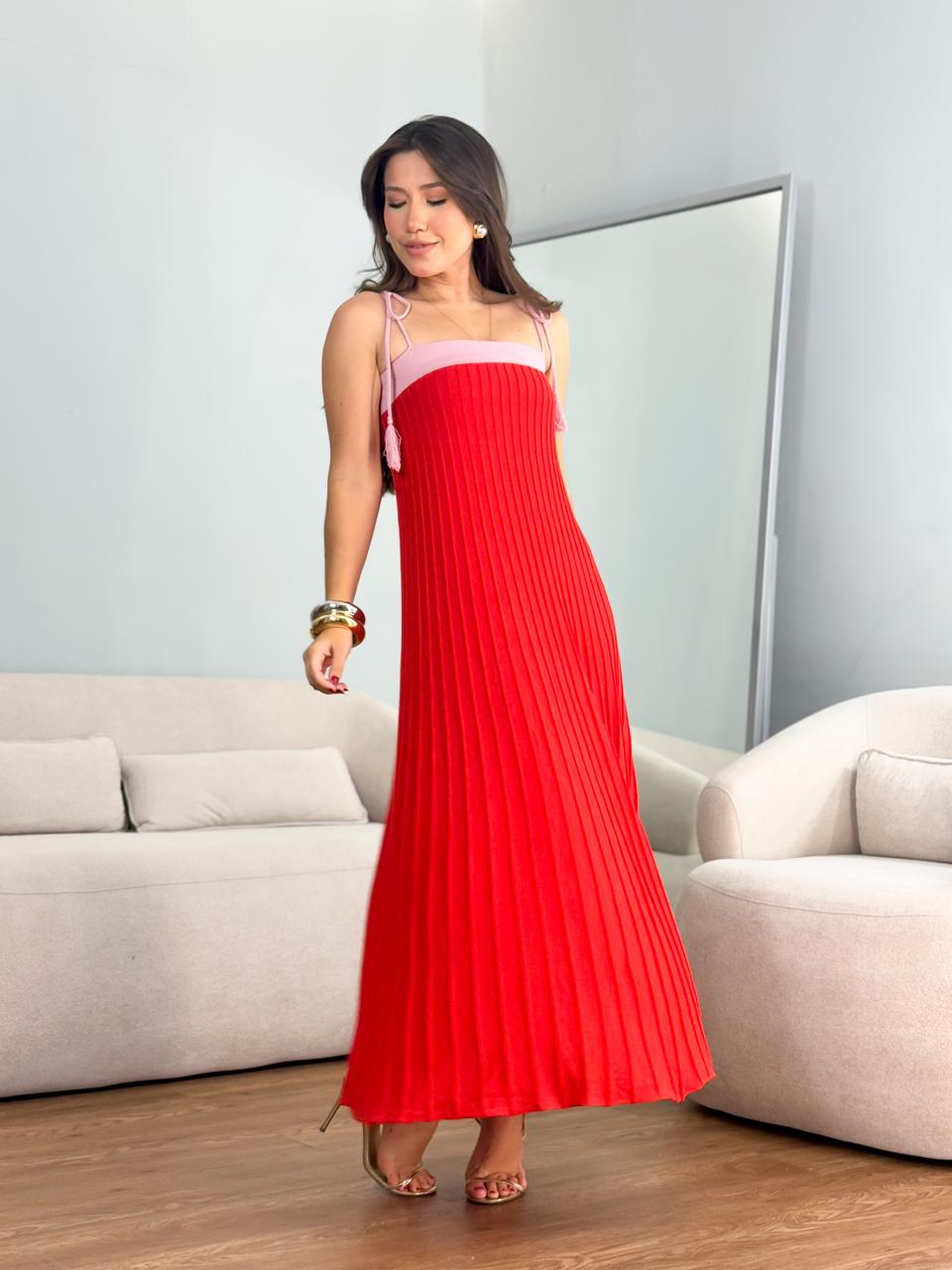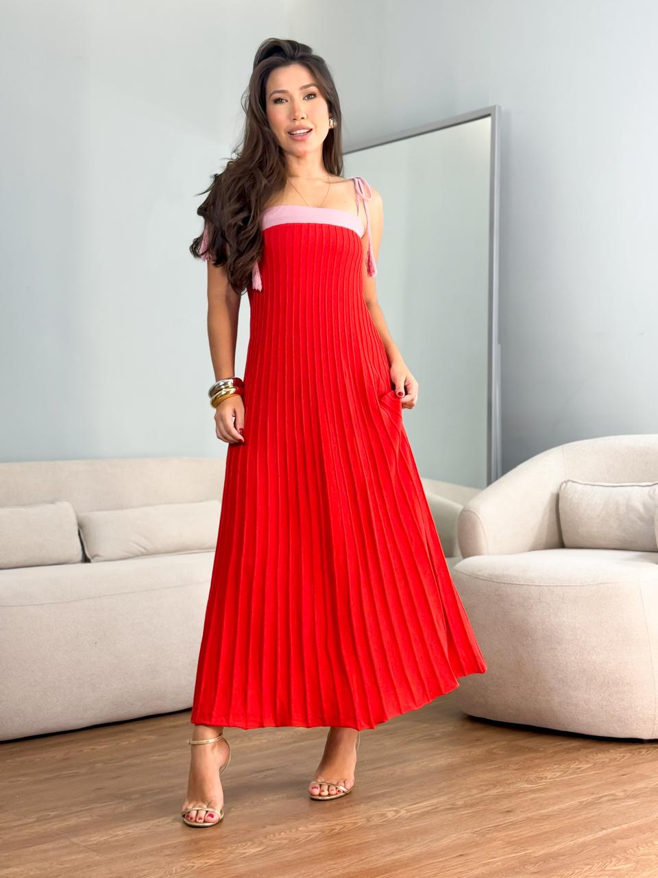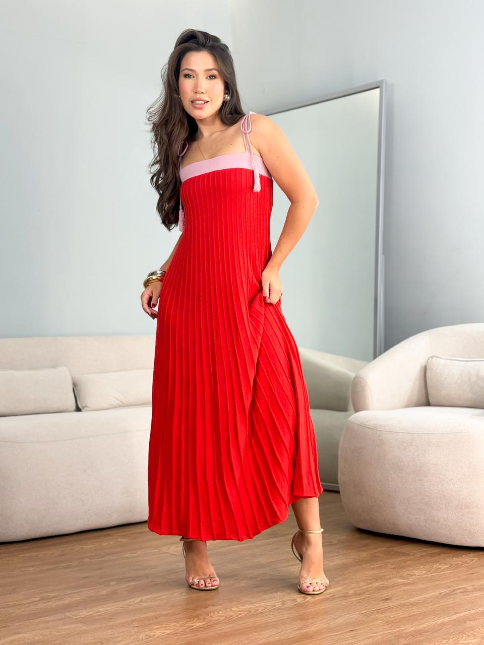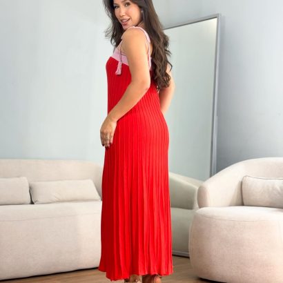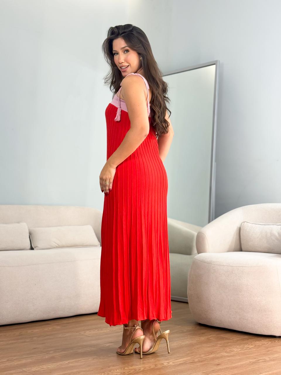 Vestido tricot modal relevo peito reto evasê midi alça amarração.