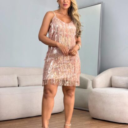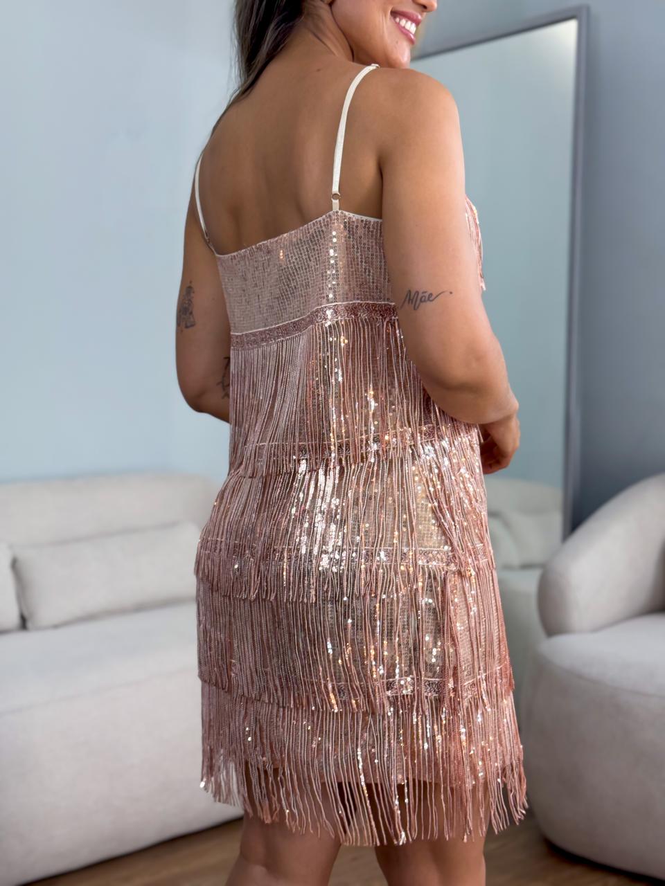 Vestido tubo franjado paetê alça fina