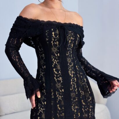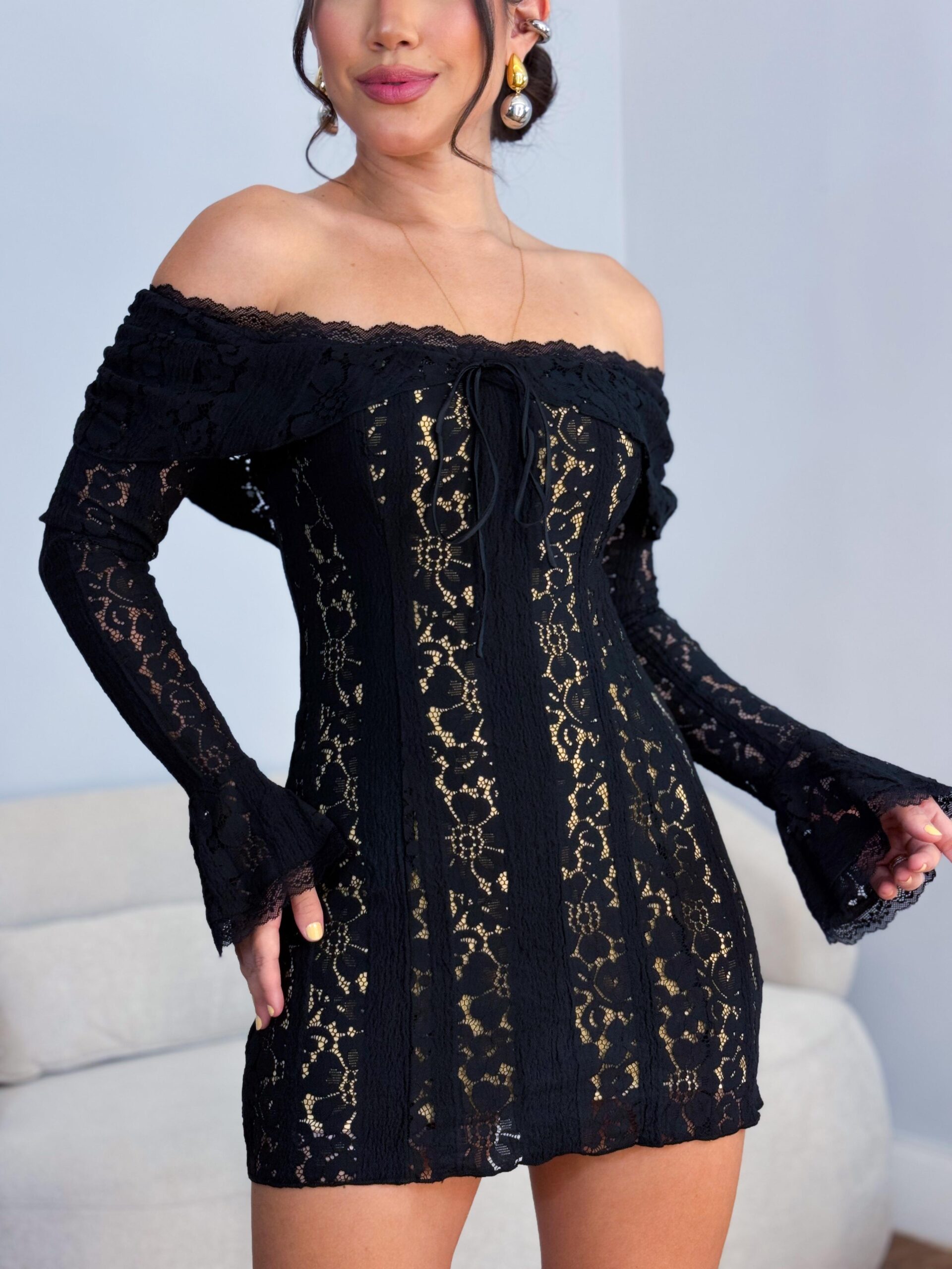 Vestido tubo rendado vintage manga longa sino ombro a ombro