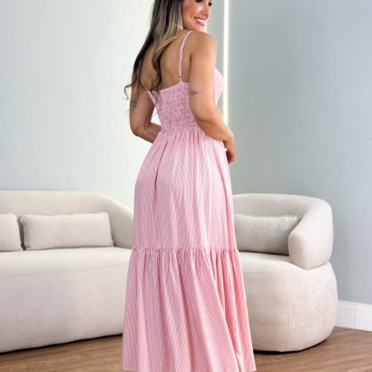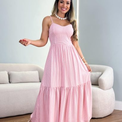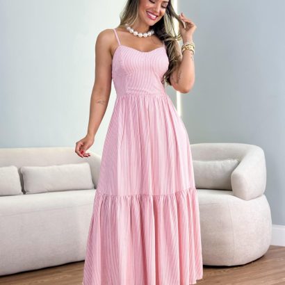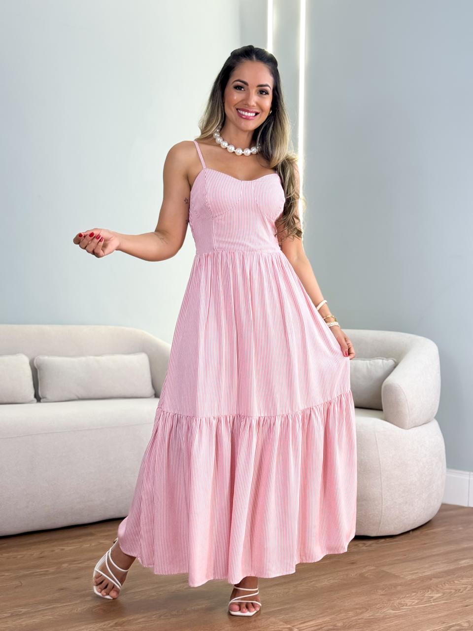 Vestido viscolinho longo barrado peitinho alça listra verão.
